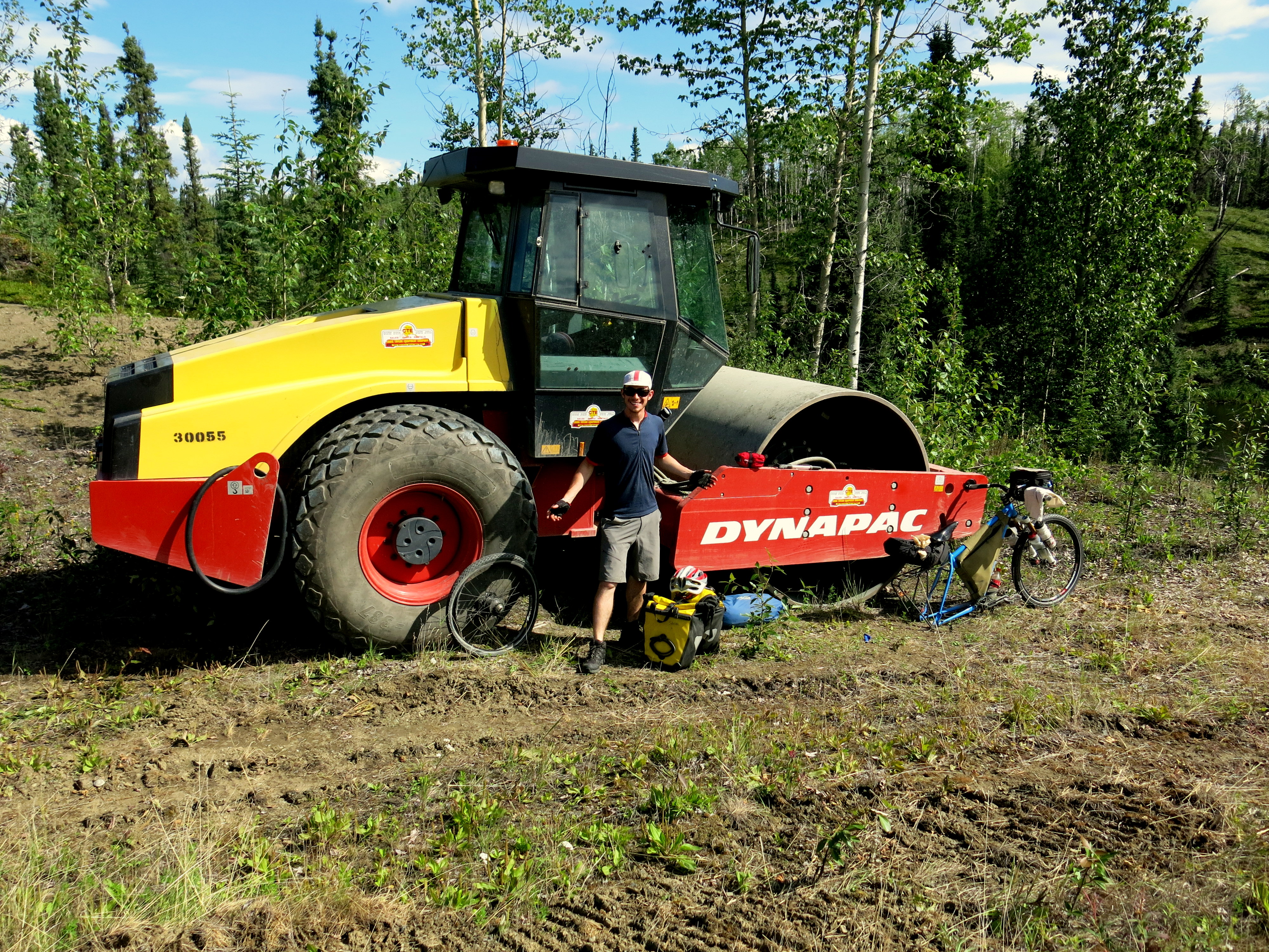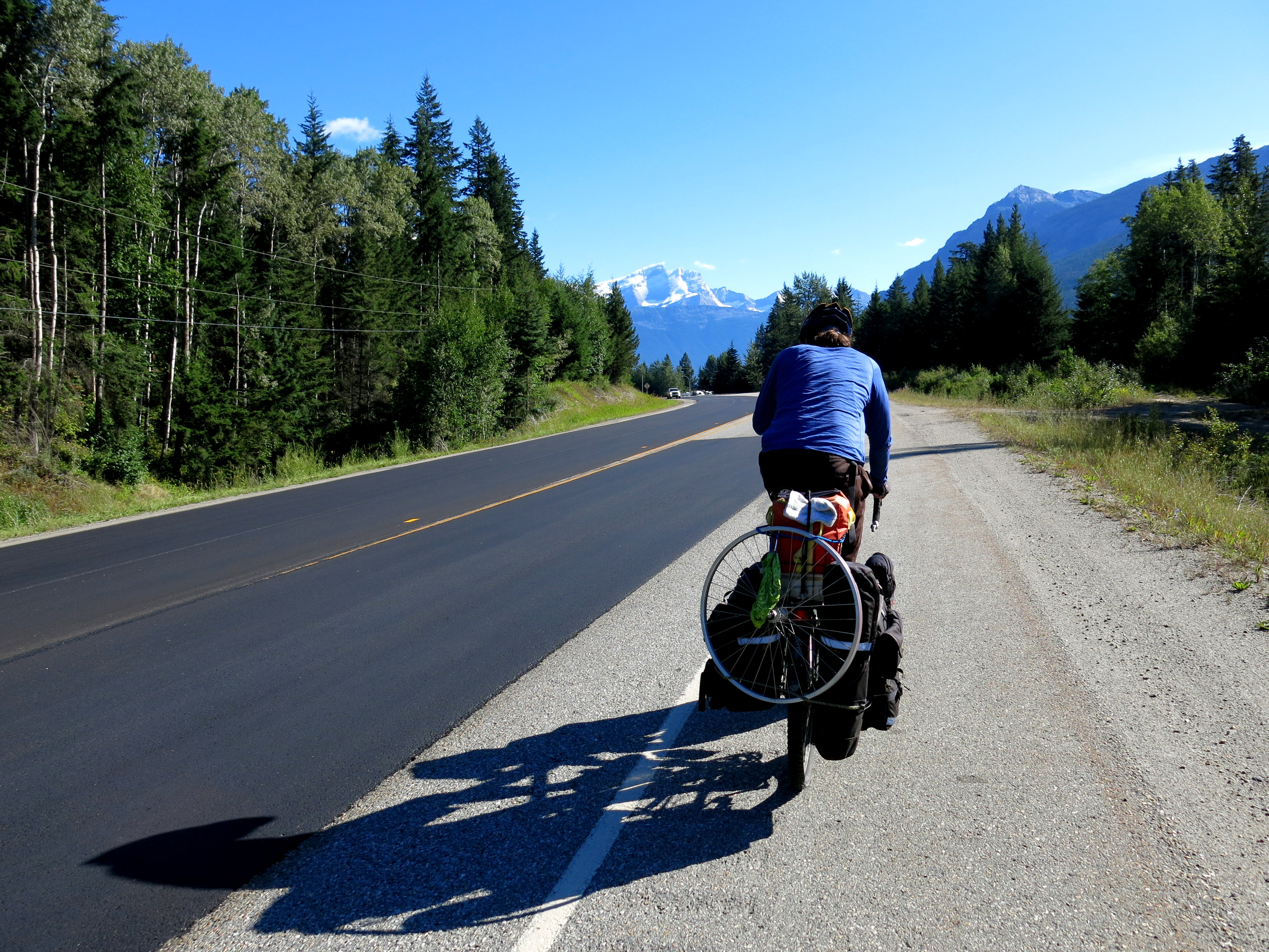At Mount Robson Nat’l Park, just before Jasper, we take a day off to go on an all-day hike, working some muscles that our bodies aren’t at all used to exercising. The views are worth it, plus the first campground in the park, 8km in, we’re allowed to bike to. Mountain bike territory for sure, the road there is a mostly well-packed dirt road through the park, though plenty of rocks in some places. An opportunity to test out Acero on mountain biking trails fully loaded, and he handles beautifully, though less weight (currently carrying plenty of food and cookies) would be nice. Not too hard of a ride to get to the campground, some steep uphill stretches become nice descents on the way back. After Mount Robson, we’re back on the road to Jasper. A Dutch cyclist joins us at Mount Robson, so now as we’re riding we speak a blend of English (everyone understands)/French (I’m learning some useful phrases)/Spanish (to practice for what’s ahead)/Dutch (why not?)/German (when we need to swear).