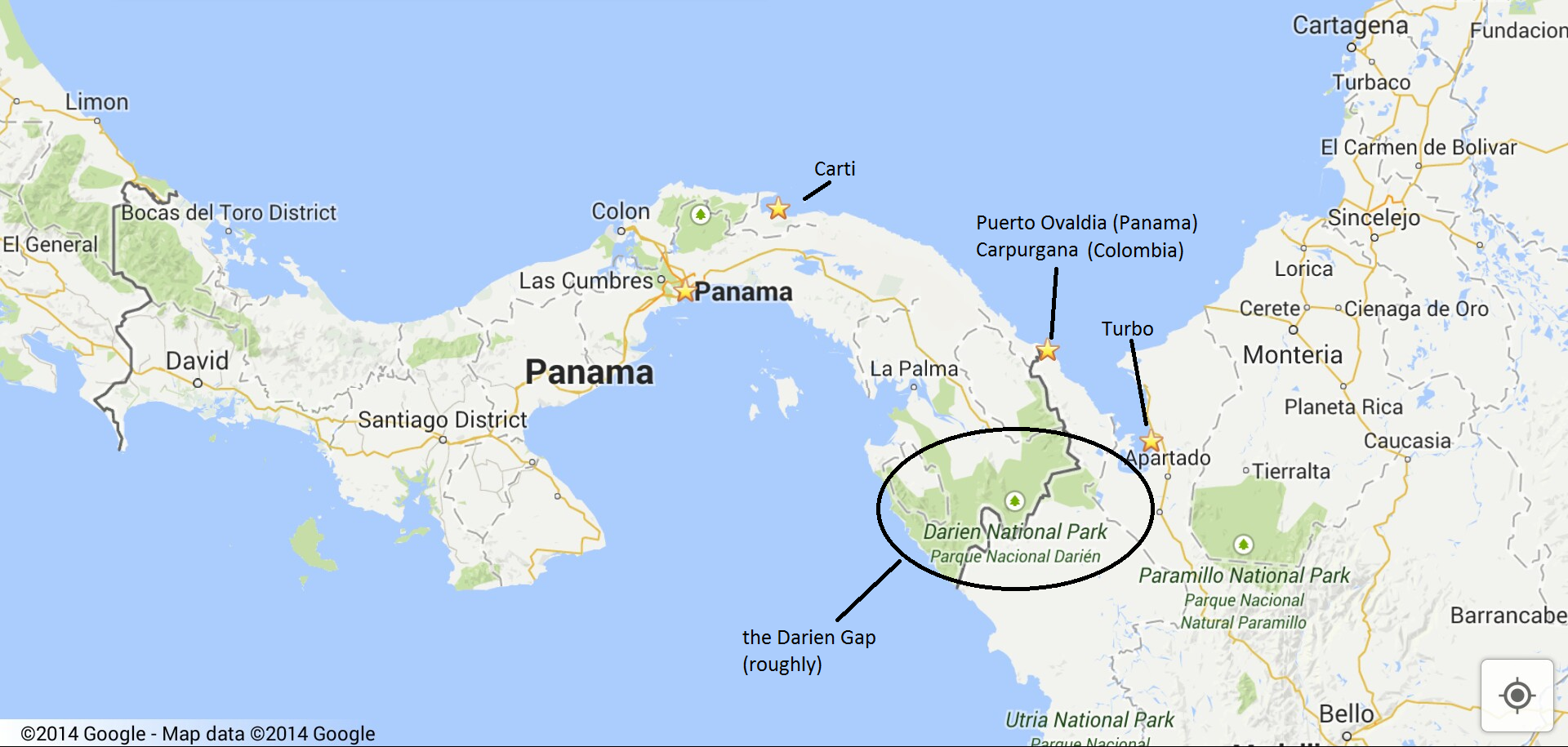 Small map of the Dairen Gap. The Gap is a missing section of roads between Panama and Colombia (really the only missing section between Alaska and Argentina), about 100miles long on the Panama side and 60miles long in Colombia. Home to messy swamps, mountains, and numerous guerilla forces. The last reported crossing by bike was Ian Hibell in the 70s, and various people have walked through between then and now, but the guerilla forces have also become much more prevalent since then. I’m a little skeptical about the claim of no roads- even muddy singletrack trails would be passable on bike- but the unanimous opinion is that the paramilitary forces are very dangerous. So I took a boat around, of which there are many.
