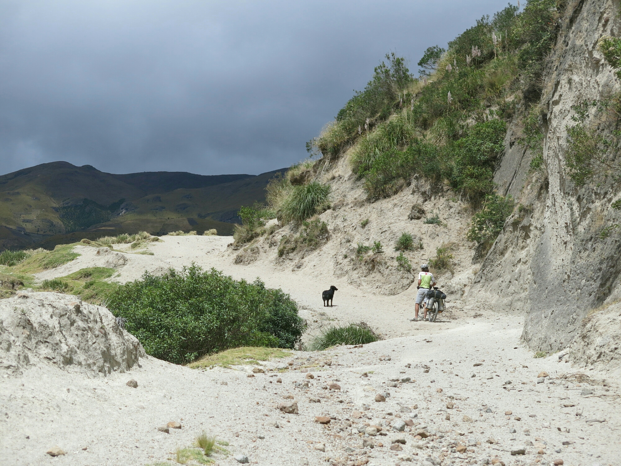 Reaching the road reveals it to be nothing but sand. Brief rideable stretches followed by more pushing. Likely great fatbike territory. This part’s rideable in the wet season would be very questionable; the route to Chugchilan might be a better option then.