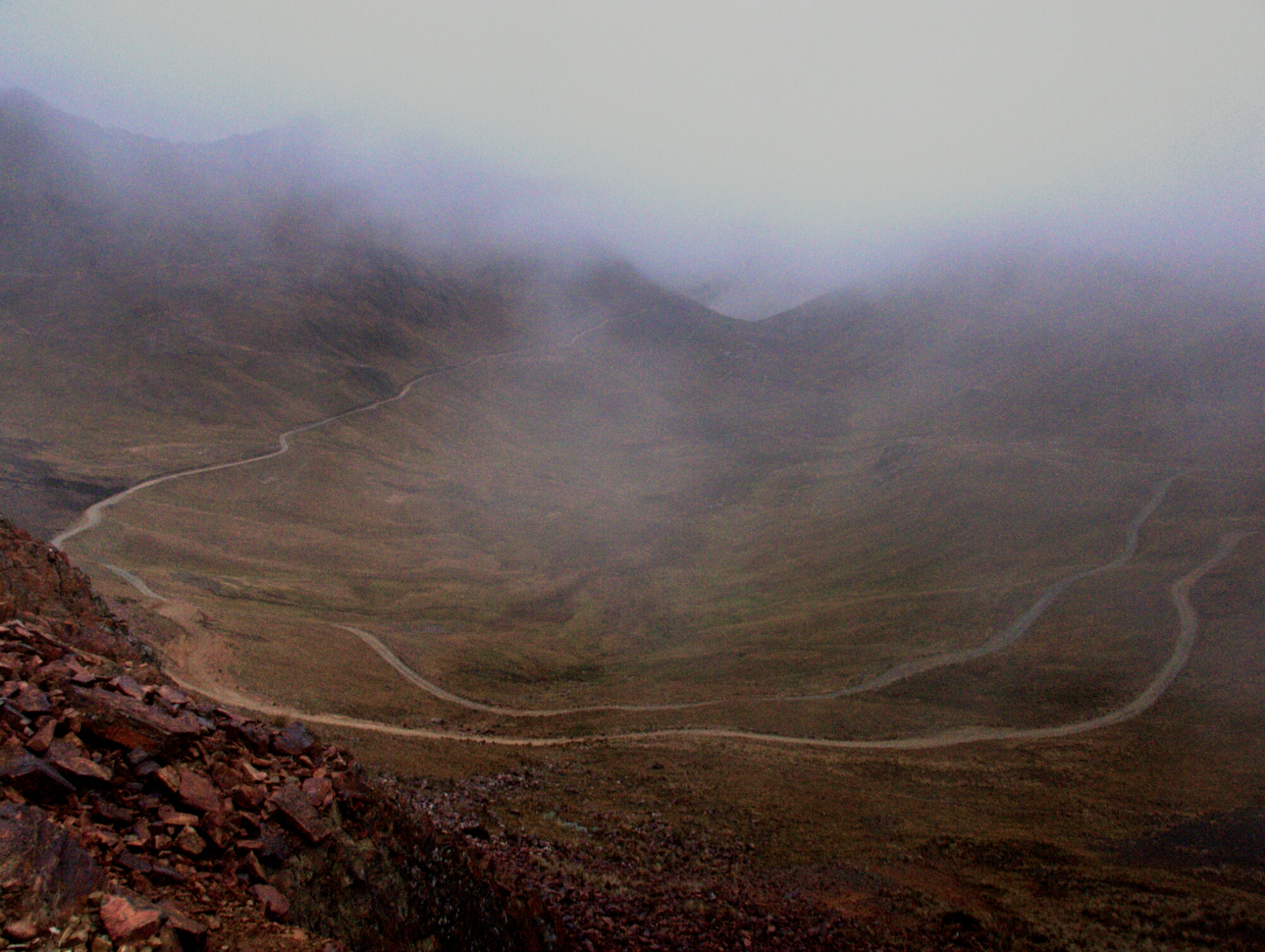 imageLeaving the Pampa el Condor to reach the town of Pampas, we peaked around 4500m only to look down at the start of the 26km descent. The only problem? Night and darkness due in 30min. One of the crazier descents of this trip- food and a bed in Pampas driving us on, navigating by the failing batteries of one headlamp for two people. But even that light all but useless, because to get down from 4500m you need to drop through a layer of cloud and fog, neither ideal to shining a light forwards. Picking lines based on an estimation of where the road drops off to my right and where Paul is riding to my left, blindly trusting that Paul knows where he is in relation to the other side of the road… just a little bit hairy.