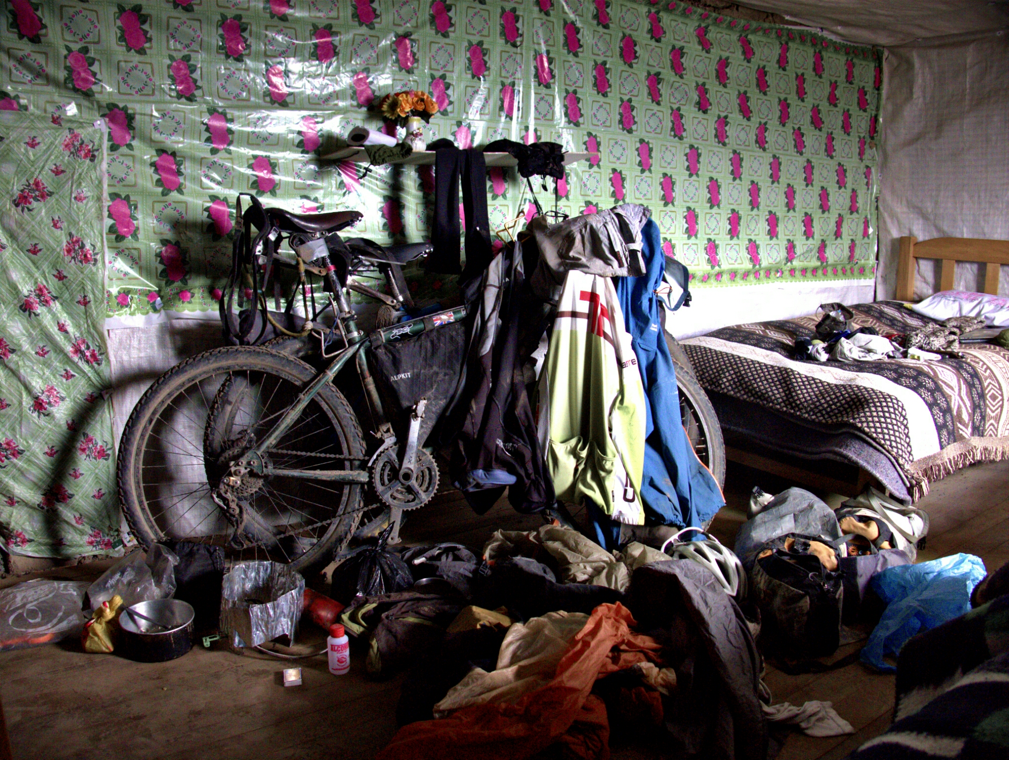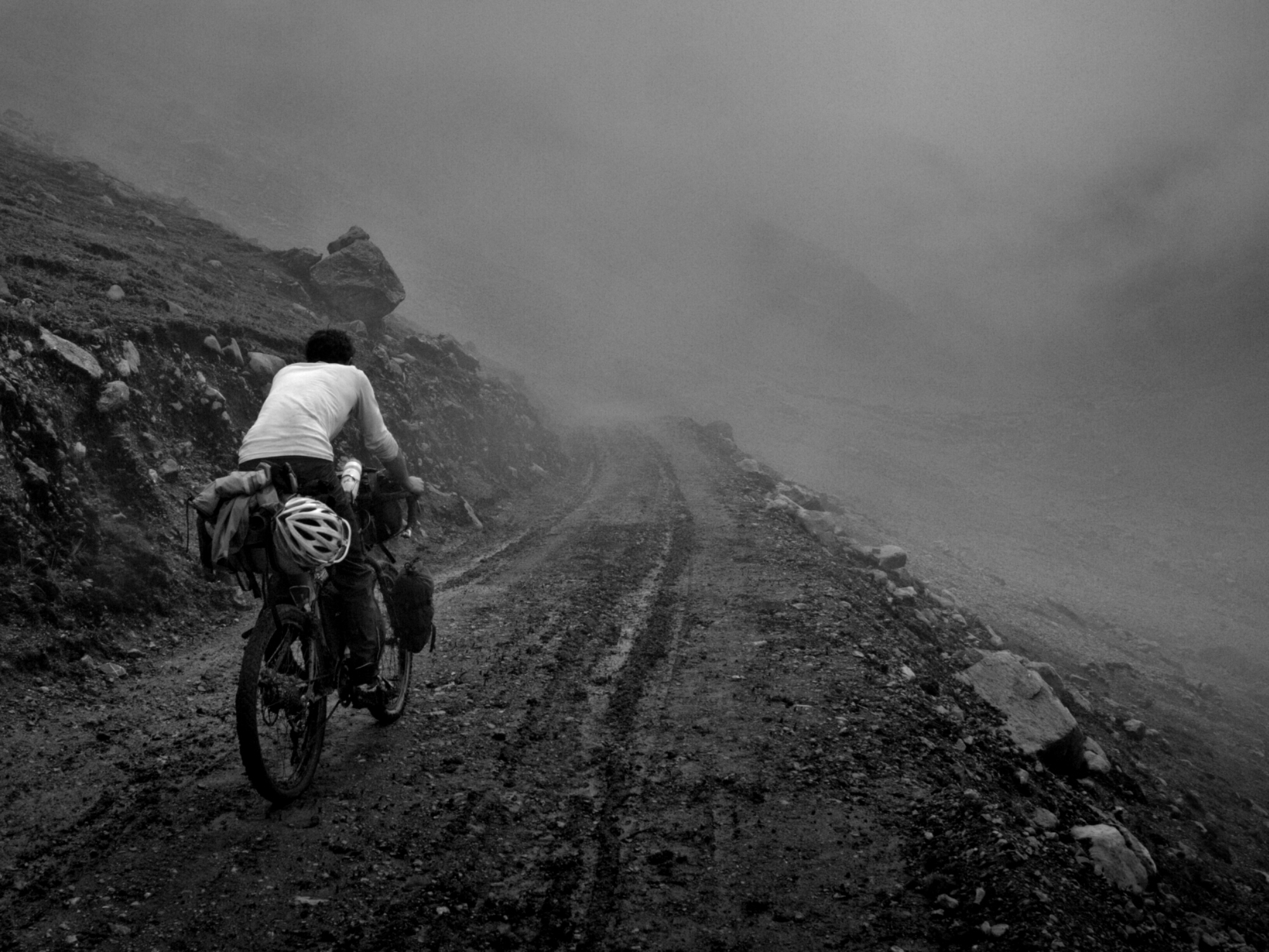 Spinning upwards into whiteness, mud hurled everywhere. Ground saturated, movement possible only by dropping tire pressure and pedaling in an ever lower gear. Andean rainy season in all of its menace. Paul just visible ahead, a vague bicycle shape silhouetted against a background of mist.
