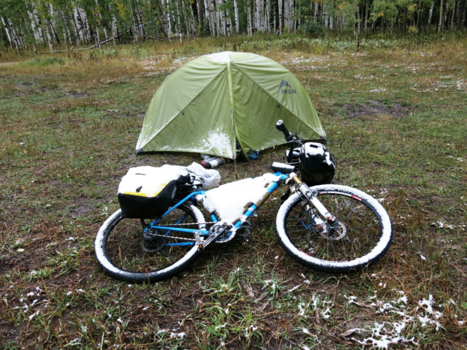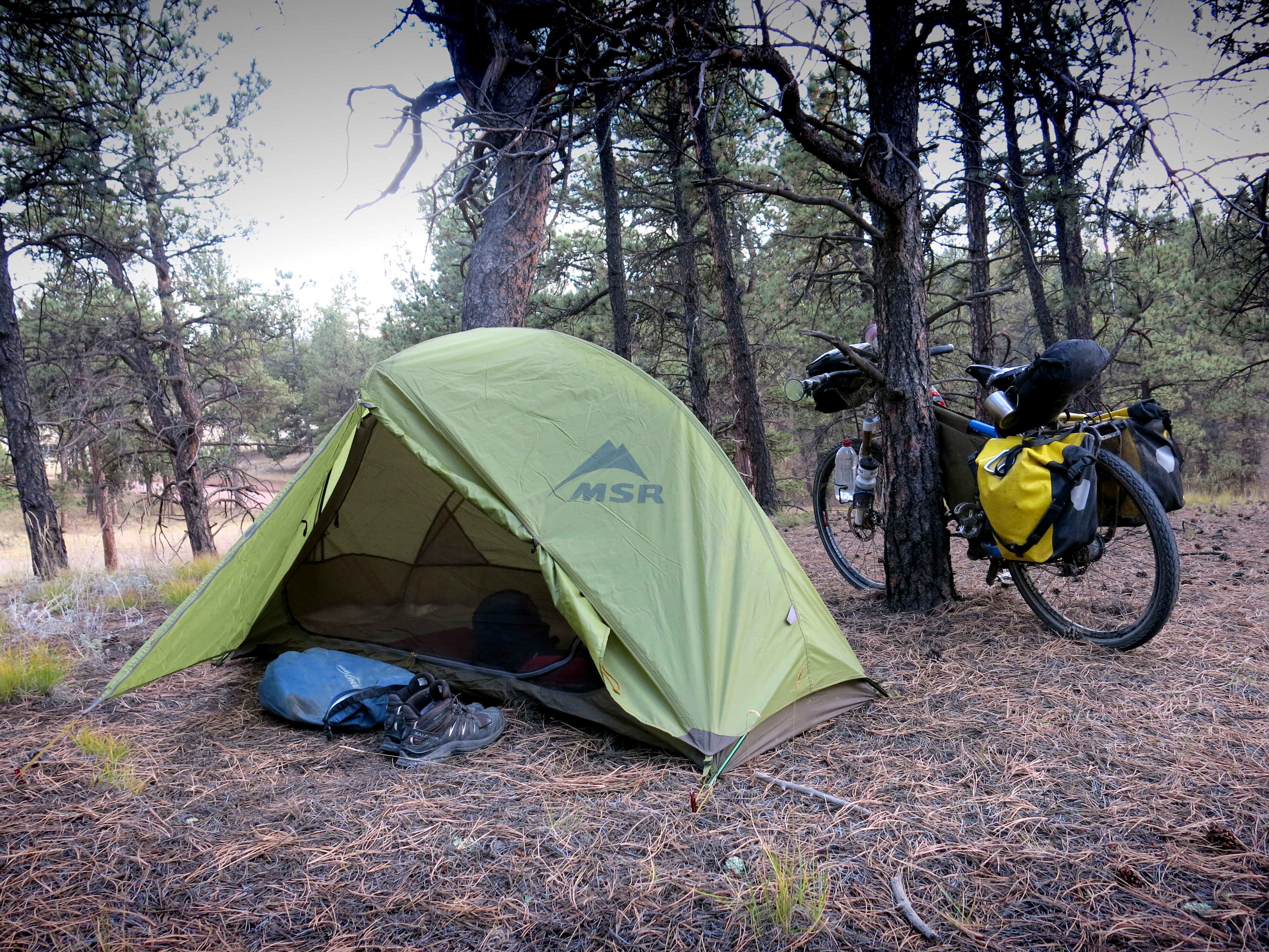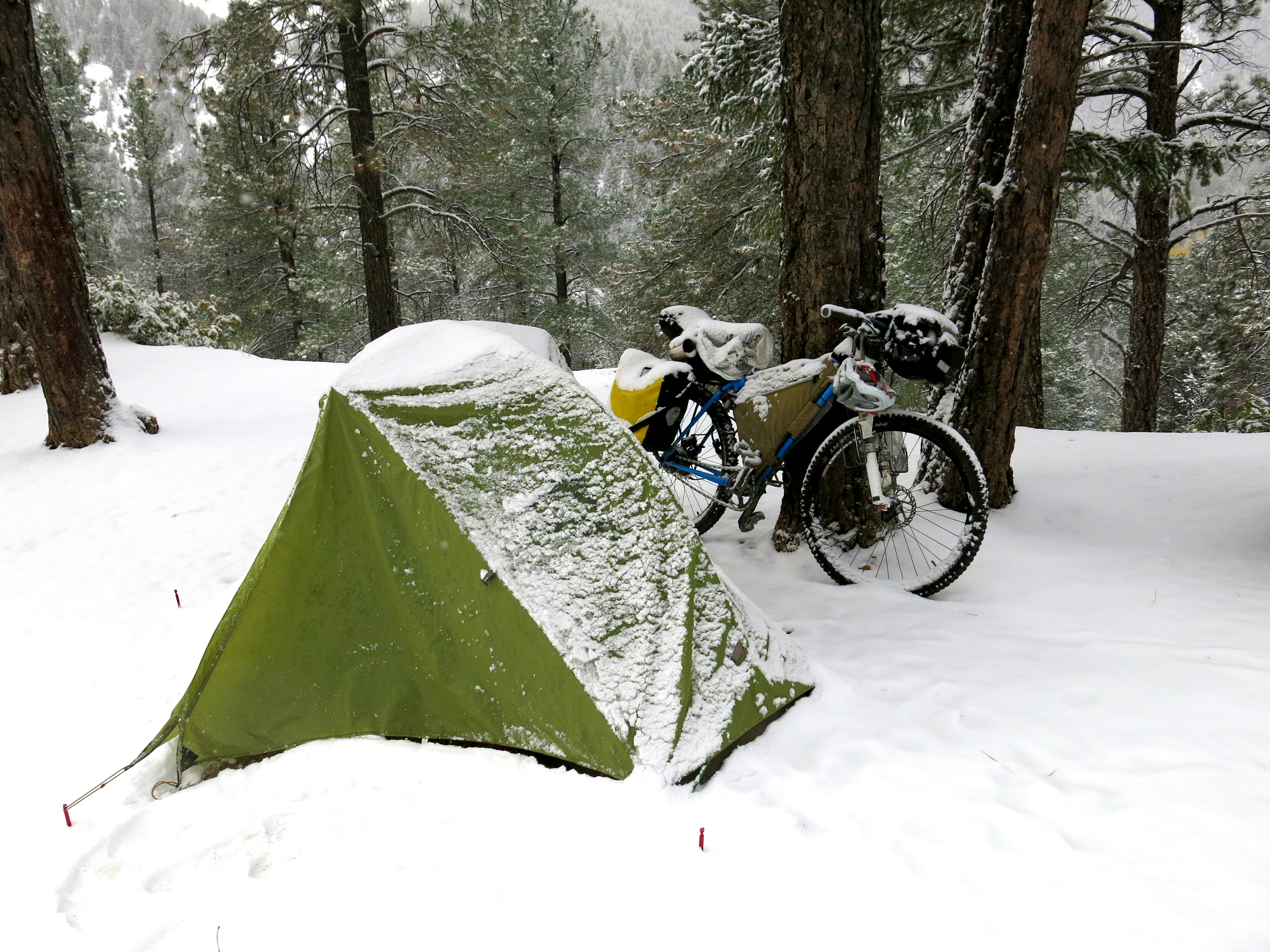 The warnings in the Divide maps for New Mexico are all about rain, which apparently changes the dirt here into an impenetrable mud. Storms brewing diverted me to a lot of road alternates for this section of the Divide, which ultimately worked out well. Here I pitched my tent for the night with Kirk, who has been hiking his way south from the Canadian border in June along the Continental Divide Trail. The CDT sticks as close to the Continental Divide as possible, whereas the Great Divide biking route sticks more to dirt roads that parallel the Divide. Kirk would be the first of the CDT hikers I got to meet, for while there aren’t many bikers riding the Divide this late in the year, November is apparently when many of the southbound CDT hikers get to New Mexico. Fun group of people, and interesting to see some of the differences between long-distance hikers and bikers. I think we both raised our eyebrows at each others’ paces.