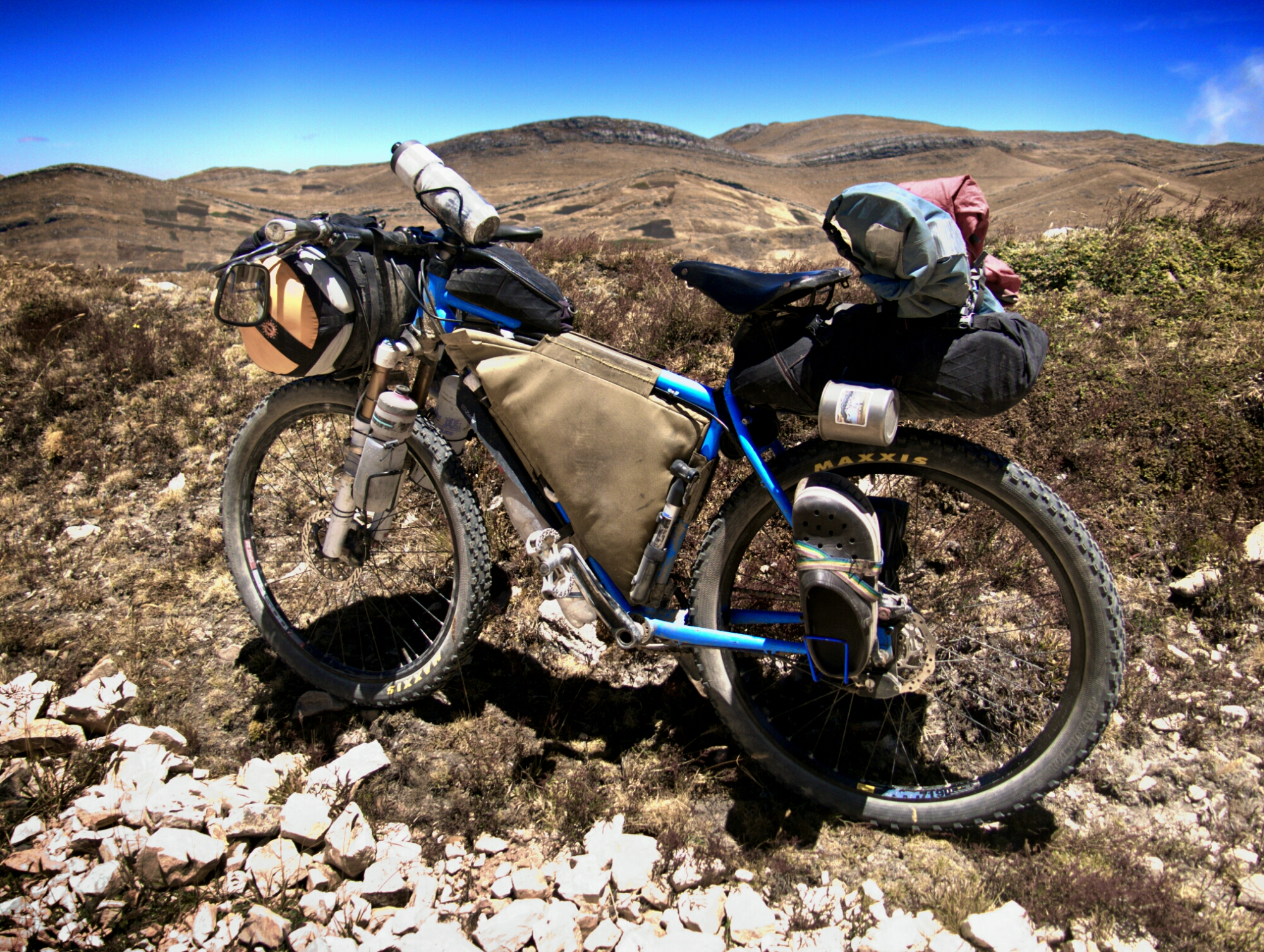 Tires: alternatively 2″ wide Schwalbe Mondials (Alaska to Ecuador), 2.25″ Schwalbe Big Bertha up front with 2.25″ Schwalbe Smart Sam in the rear (Colorado/Arizona), currently running 2.25″ Maxxis Ardents (Ecuador onwards). Briefly used a 1.6″ Schwalbe for paved Ecuador exit/Peru entrance.